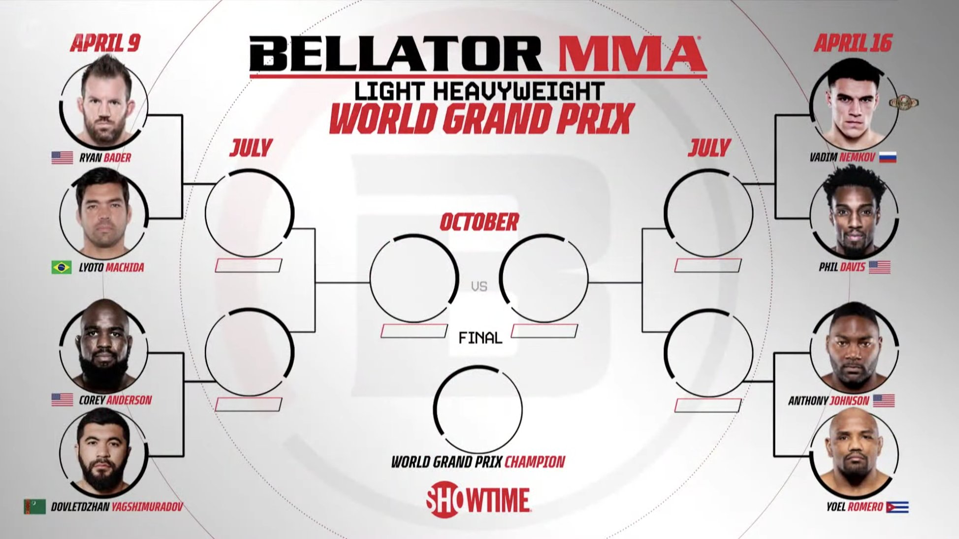 De acordo com as chaves reveladas durante a coletiva de imprensa, Lyoto Machida encara Ryan Bader, atual campeão, no dia 9 de abril. Na mesma data, Corey Anderson mede forças com Dovletdzhan Yagshimuradov, e os vencedores dos duelos se classificam para a semifinal a ser realizada no mês de julho.
