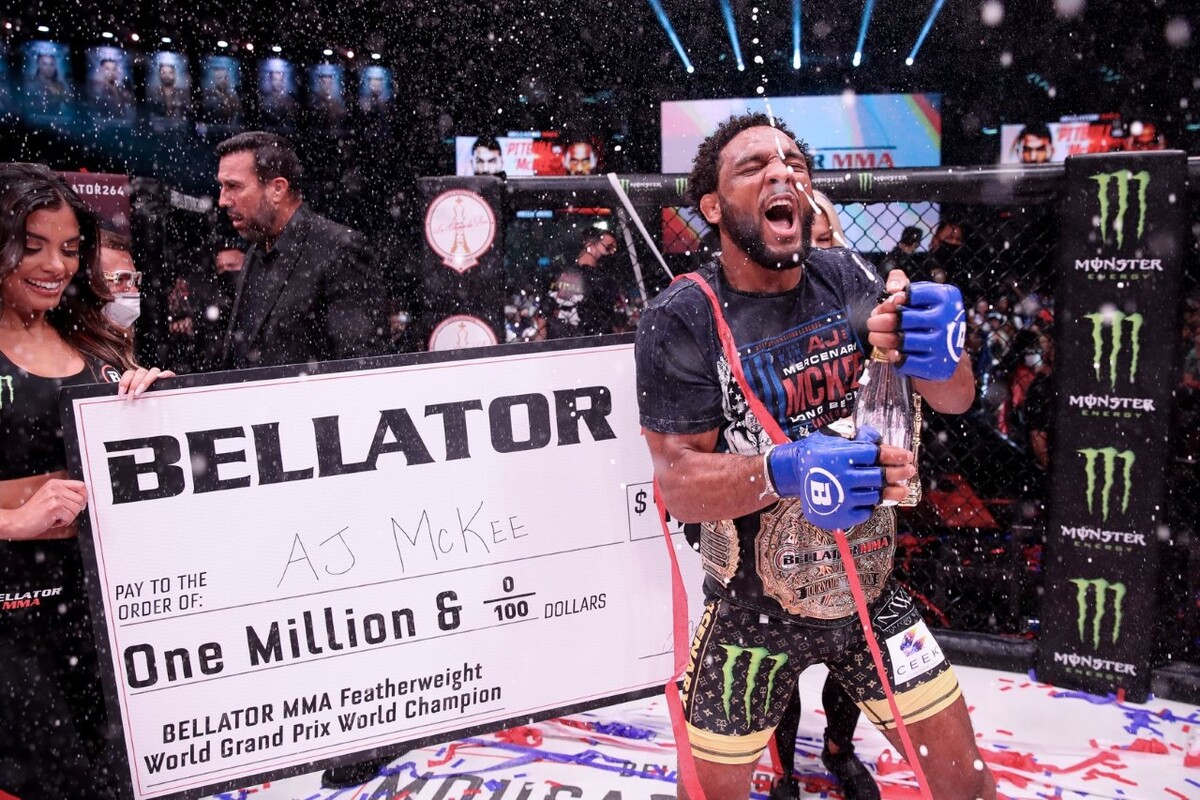 AJ McKee fez história no Bellator 263. No evento realizado no último sábado (31), na Califórnia (EUA), o americano enfrentou Patrício Freire na final do GP do peso-pena (66 kg) e, simplesmente, não tomou conhecimento da lenda da organização. ‘Mercenary’ precisou de menos de dois minutos de luta para finalizar ‘Pitbull’ e, consequentemente, faturou o torneio, o cinturão da categoria e um milhão de dólares (cerca de R$ 5 milhões). Mas, ao que parece, o atleta não está satisfeito.