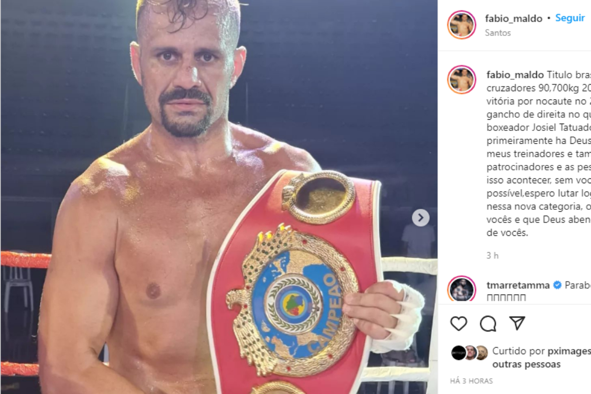 Ex-lutador do UFC, Fábio Maldonado mostrou mais uma vez que tem o boxe afiado no último sábado (12) e garantiu mais uma importante conquista na sua carreira. O ‘Caipira de Aço’, como é conhecido, nocauteou Joselito dos Santos, o ‘Tatuado’, em evento realizado na cidade de Santos (SP), e se sagrou campeão brasileiro do peso-cruzador (90,7 kg) do Conselho Nacional de Boxe.
