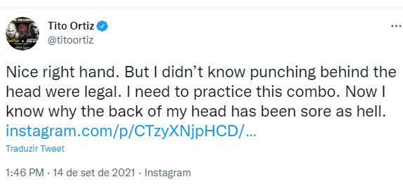 “Boa direita. Mas eu não sabia que socar atrás da cabeça era legal. Eu preciso treinar essa combinação. Agora eu sei por que a parte de trás da minha cabeça está dolorida para c***”, reclamou Tito Ortiz.