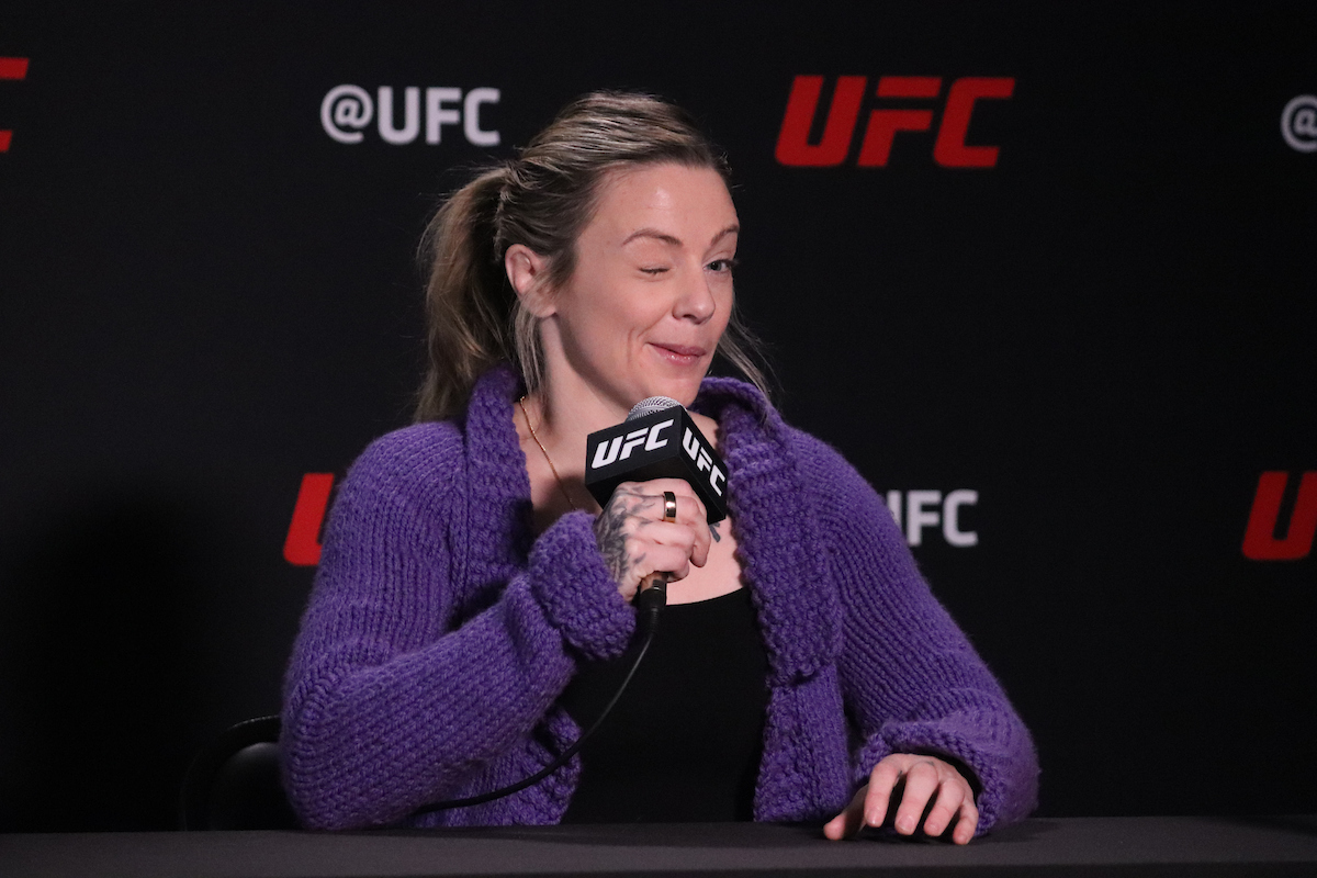 LAS VEGAS, NV - NOVEMBER 17: Joanne Calderwood interacts with media during the UFC Vegas 43: Tate v Vieira Media Day at UFC Apex on November 17, 2021 in Las Vegas, Nevada, United States. (Photo by Diego Ribas/PxImages)