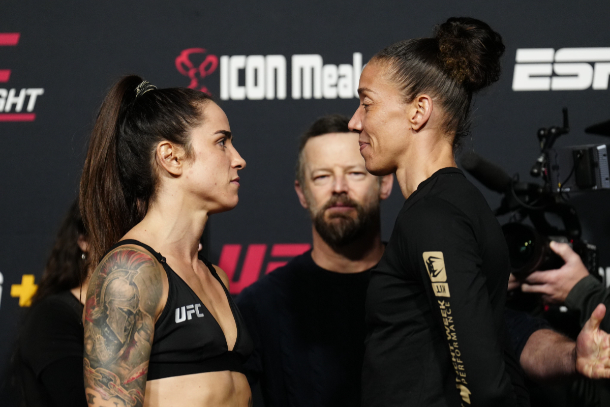 Apesar de já figurar na 11ª posição do ranking até 61 kg do Ultimate, Norma Dumont fará sua primeira aparição na categoria na organização neste sábado. Anteriormente, a brasileira conquistou sua vaga no top 15 em duelos travados com 66 kg – categoria que não conta com listagem oficial e tende a ser abandonada pelo UFC. O primeiro passo para o debute foi dado nesta sexta-feira durante a pesagem oficial, com a mineira vencendo a balança e confirmando seu embate contra Germaine.