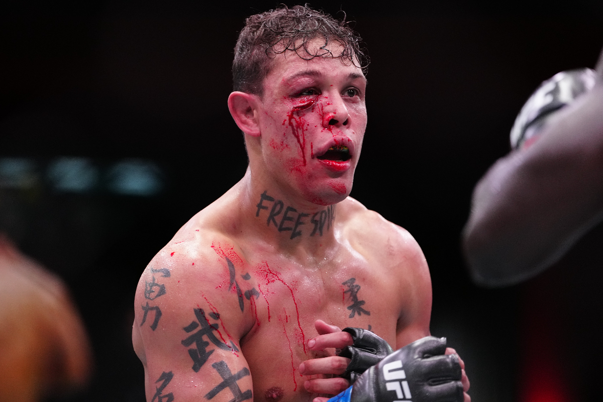 Diante de um oponente perigoso, o brasileiro ficou com marcas da guerra no rosto, em duelo que posteriormente foi eleito a 'Luta da Noite' - Louis Grasse/Ag Fight