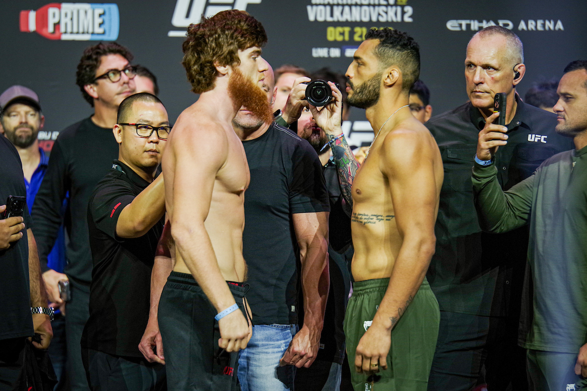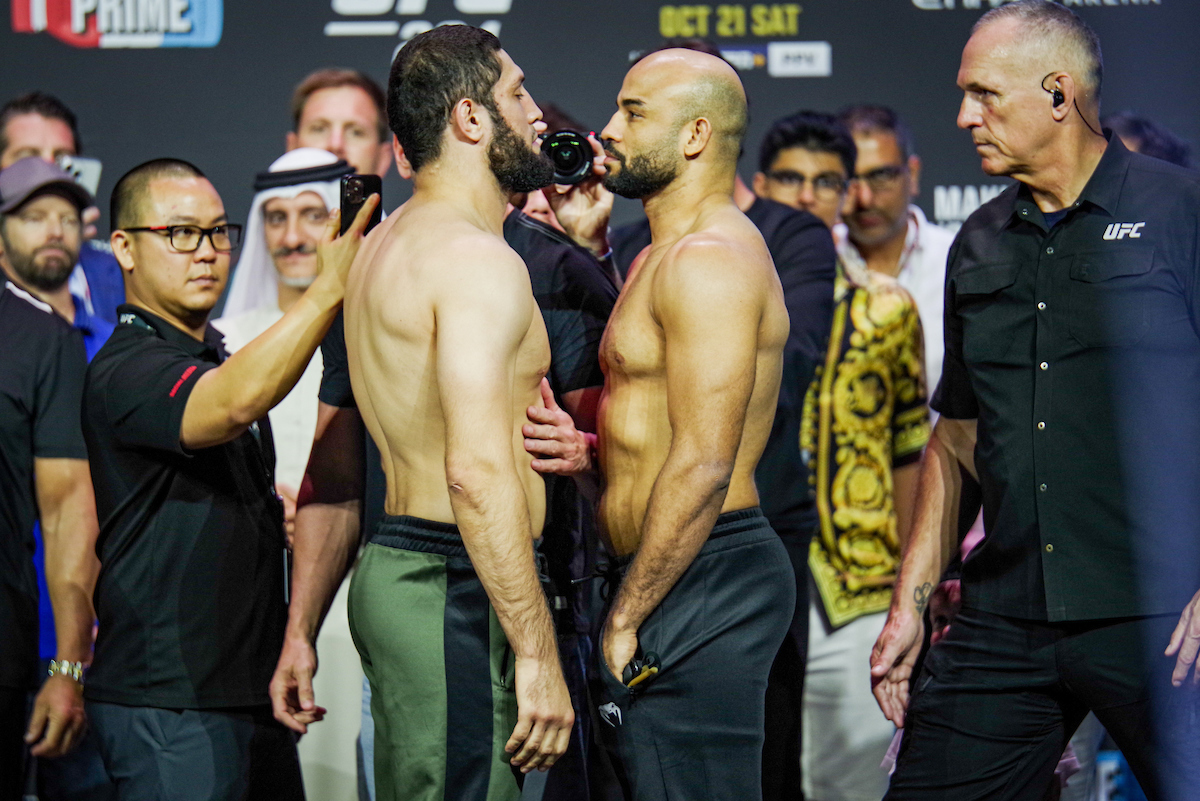 A encarada entre os dois protagonistas do 'co-main event' do UFC 294 foi uma das mais acaloradas da cerimônia - Matt Davies/Ag Fight