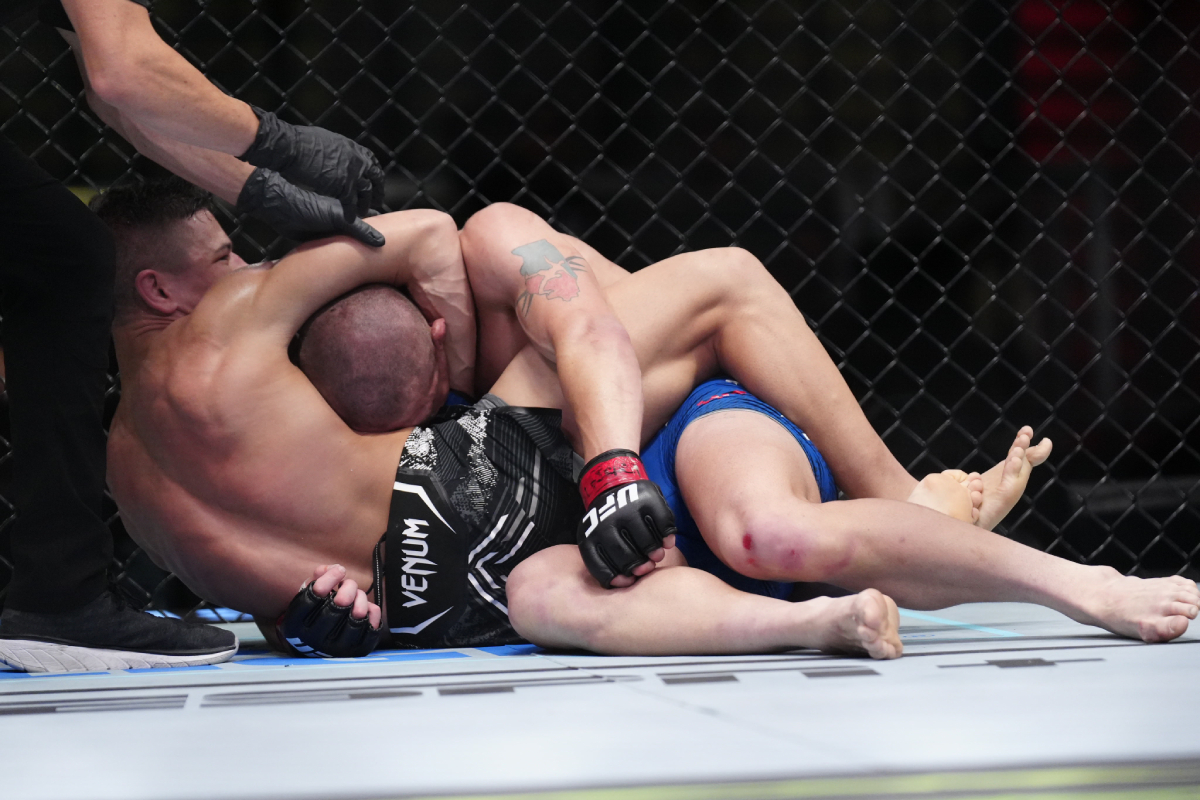 Restando poucos segundos para o fim do segundo round, porém, Jean Matsumoto encaixou uma apertada guilhotina e colocou seu rival para dormir - Louis Grasse/Ag Fight