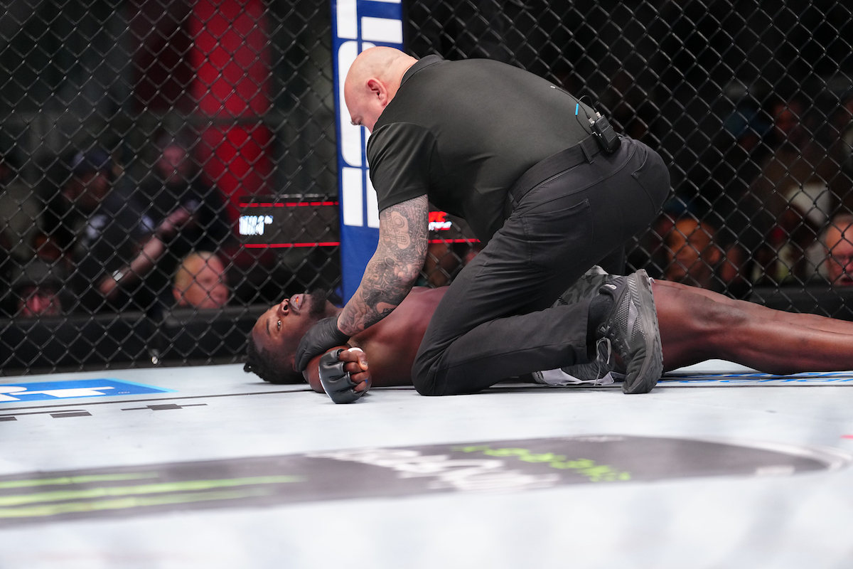 A potência e precisão do golpe aplicado por Cesinha Almeida fez com que Abdul Razak Alhassan caísse já desacordado na lona, configurando um nocaute clássico - Louis Grasse/Ag Fight
