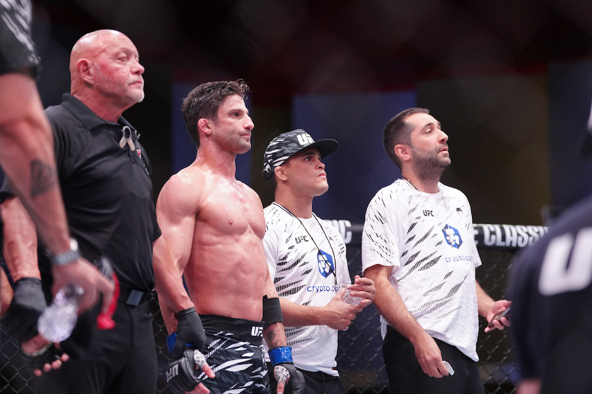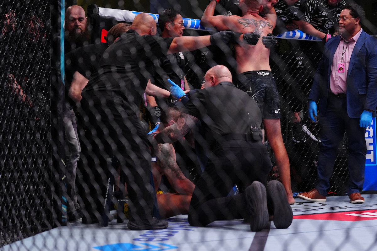 Ainda recobrando os sentidos, Bruno Lopes foi acudido pela equipe médica do UFC, enquanto Jacoby, ao fundo, comemorava o triunfo em grande estilo - Louis Grasse/PxImages