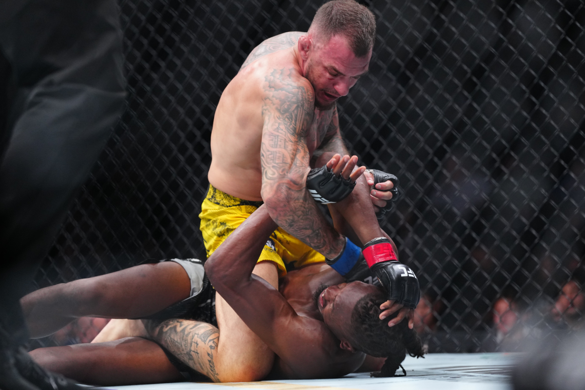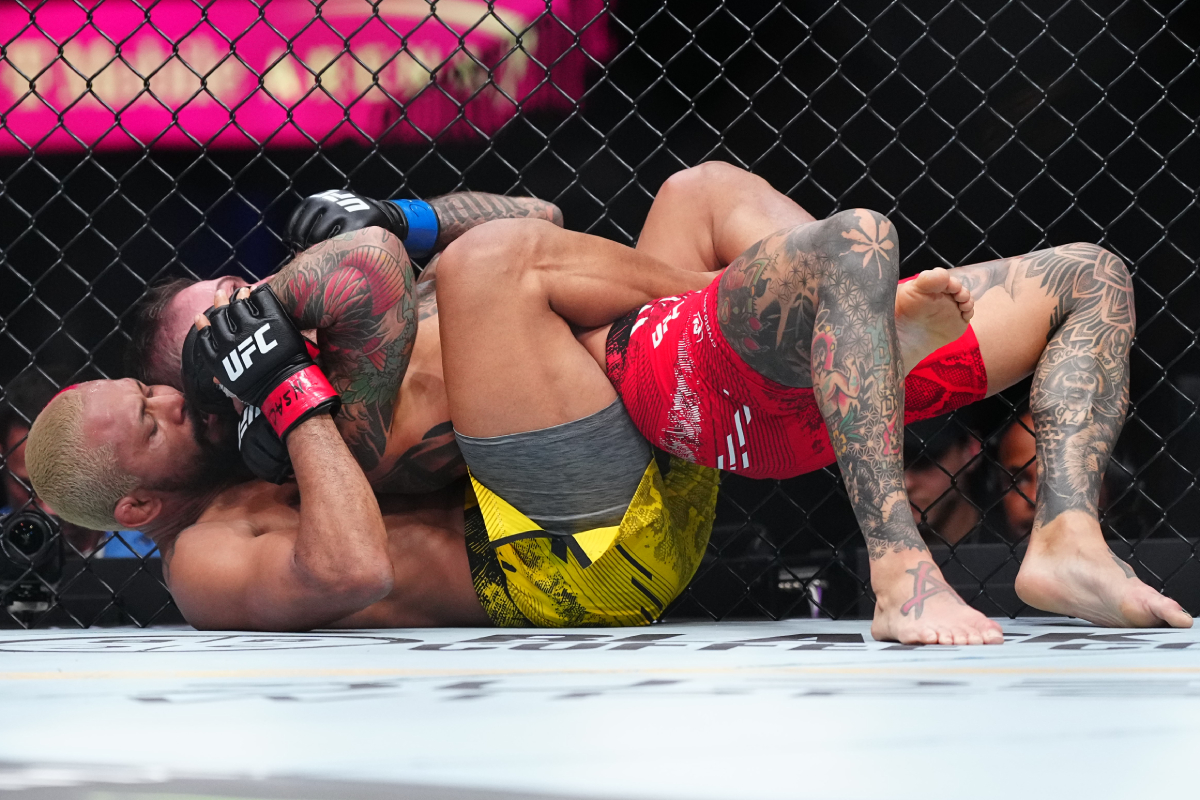Na primeira luta do UFC 300, Deiveson Figueiredo teve dificuldade contra Cody Garbrandt no primeiro round, mas não se desesperou com o poder e a velocidade do rival. Tanto que, no segundo assalto, o brasileiro derrubou o ex-campeão do peso-galo e o finalizou via 'mata-leão'. Esse foi o segundo triunfo do veterano na nova categoria, que pediu para disputar o cinturão - Louis Grasse/AgFight