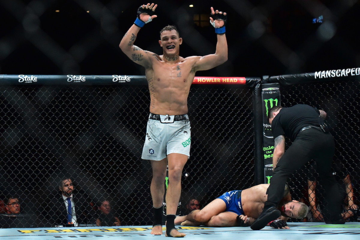 Michel Pereira deu show e brilhou no octógono. O brasileiro finalizou Ihor Potieria em menos de um minuto de luta, emplacando sua terceira vitória no peso-médio (84kg), sendo todas de forma fulminante - Leandro Bernardes/AgFight