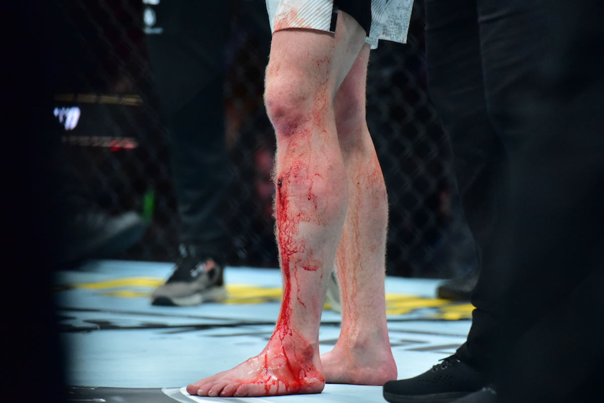 Estrago! Shore recebeu chutes tão poderosos na perna, que apresentou sangramento na região. Sendo assim, a luta foi interrompida, com a vitória ficando com Joanderson - Leandro Bernardes/AgFight
