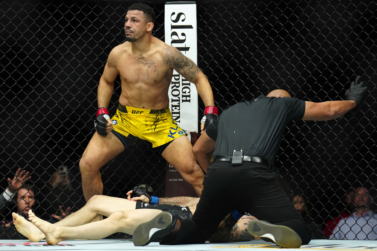 Drakkar Klose comemorou a vitória por nocaute contra Joe Solecki no primeiro round. Lutador 'apagou' o adversário ao aplicar um slam - Louis Grasse/AgFight