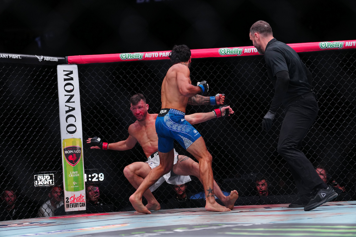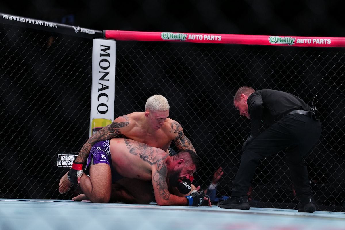 Após ser levado para o solo, 'Izzy' foi vítima do 'ground and pound' que treminou em nocaute técnico a favor de Pyfer - Louis Grasse/PxImages