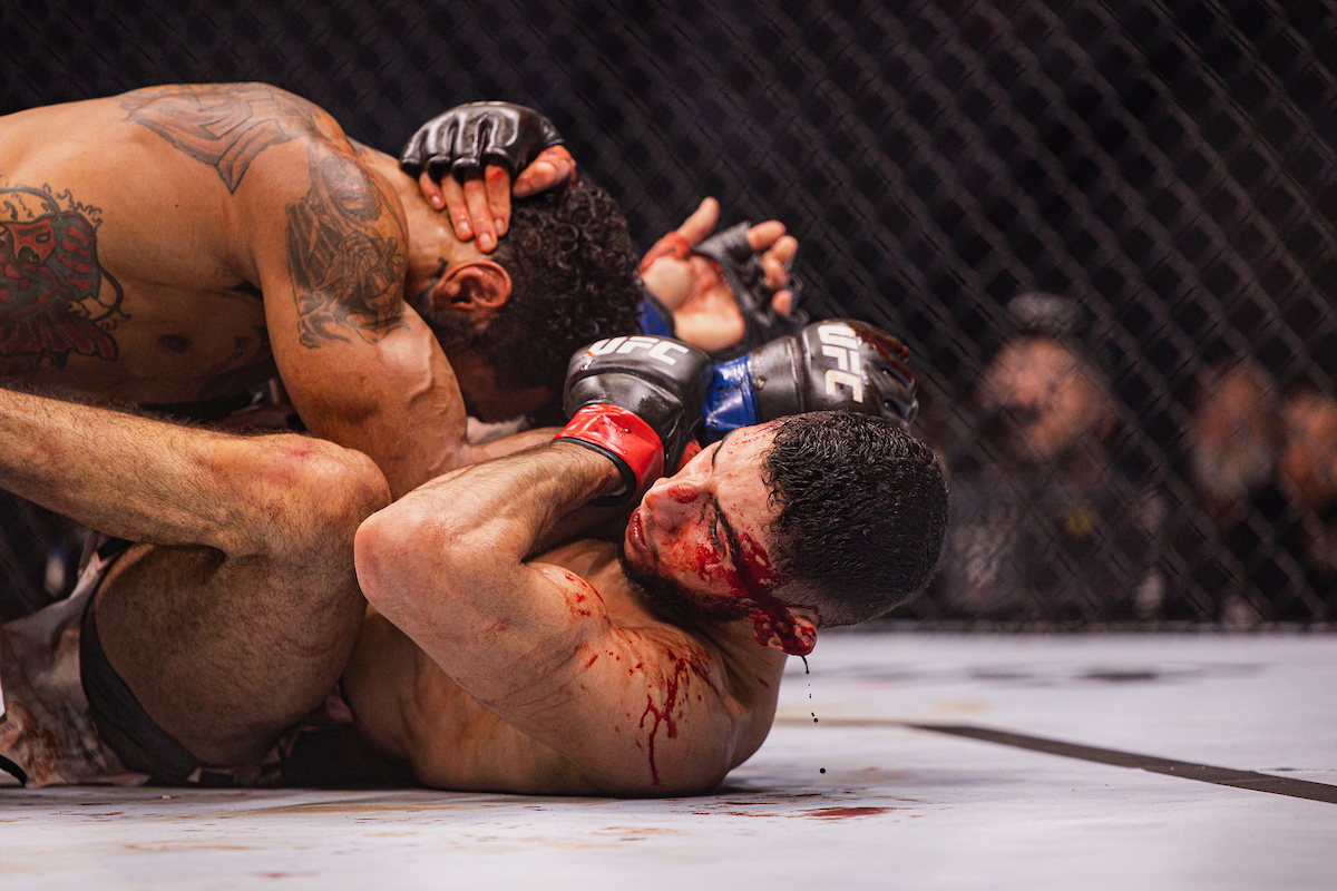 Outro duelo que levantou a torcida presente na 'anb Arena' foi a sangrenta batalha entre Faris Ziam (embaixo) e Mike Davis, vencida pelo primeiro, na abertura do card principal do UFC Arábia Saudita - Danny Perez/PxImages