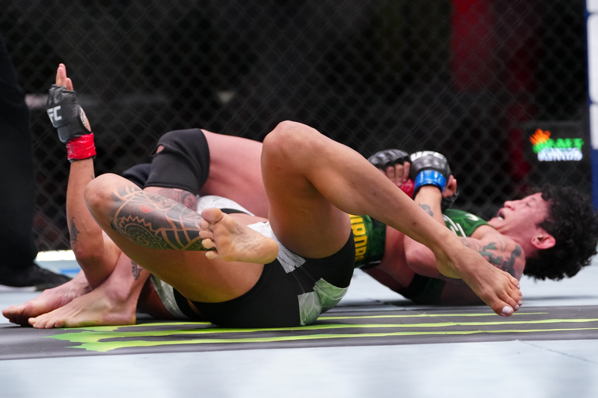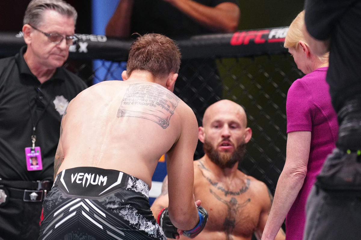Assim como Virna Jandiroba, Cody Gibson também mostrou seu fairplay no UFC Vegas 94. Após vencer por finalização no primeiro round, o integrante do peso-galo (61 kg) fez questão de verificar o estado de Brian Kelleher e cumprimentá-lo - Louis Grasse/AgFight.