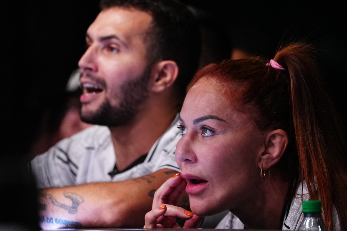 Ex-campeã do peso-pena (66 kg) do UFC, Cris Cyborg marcou presença no show. A estrela do Bellator esteve no corner de Dione e viu de perto a derrota da amiga - Louis Grasse/AgFight