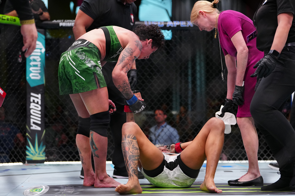 Ao final da luta, Virna esbanjou fairplay. A veterana fez questão de verificar o estado de Amanda após aplicar uma justa finalização - Louis Grasse/AgFight