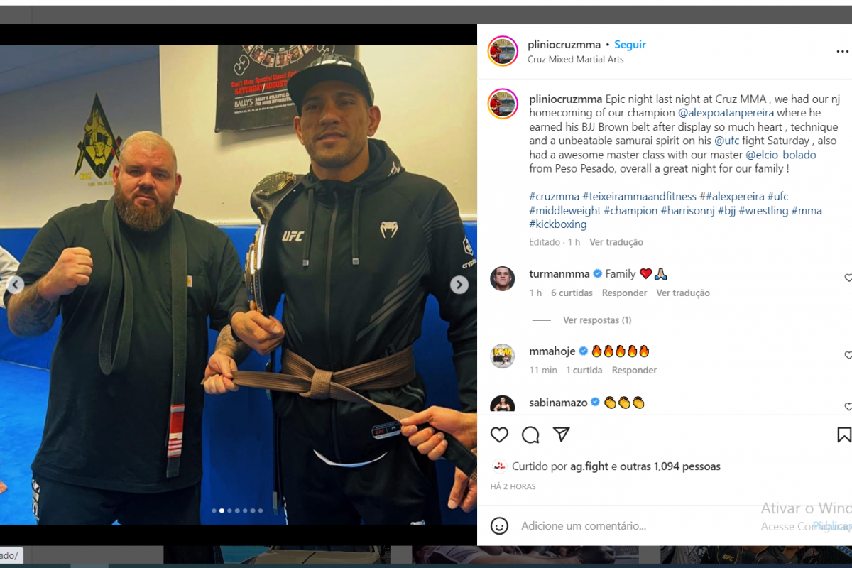 “Noite épica ontem na Cruz MMA, tivemos a recepção para o nosso campeão Alex ‘Poatan’, onde ele ganhou sua faixa marrom de jiu-jitsu depois de mostrar muito coração, técnica e um espírito de samurai imbatível em sua luta no UFC do sábado”, escreveu o treinador de Poatan.