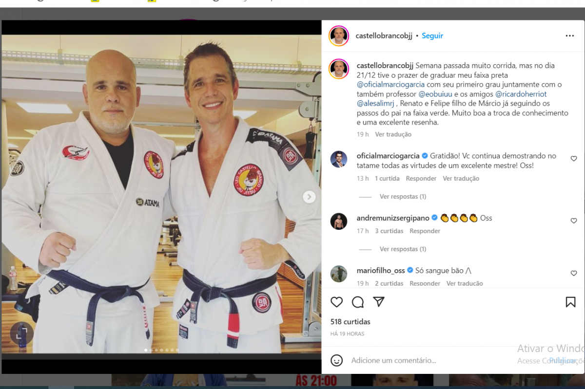 “A expressão já fala por si: não há êxito sem suor. Dentre as várias lições que o Jiu-Jitsu me ensinou e que eu levo pra vida, uma delas me faz refletir diariamente: ‘O faixa-preta é o faixa-branca que nunca desistiu’. Após ter ficado anos sem treinar, tendo parado na faixa marrom por mais de vinte anos, há três conquistei a tão desejada faixa preta, e ontem fui graduado com meu primeiro grau. Valeu a pena! Nunca é tarde pra alcançar um objetivo que tenha ficado pra trás! Quero agradecer a todos que fizeram parte dessa jornada. Em especial meu irmão e meu mestre Castello Branco (…)Gratidão! E para você que ainda não conhece a arte suave fica uma dica, conheça! O Jiu-Jitsu ajuda na formação do caráter, na perseverança, lealdade, foco e disciplina”, escreveu Garcia em sua conta do ‘Instagram’.