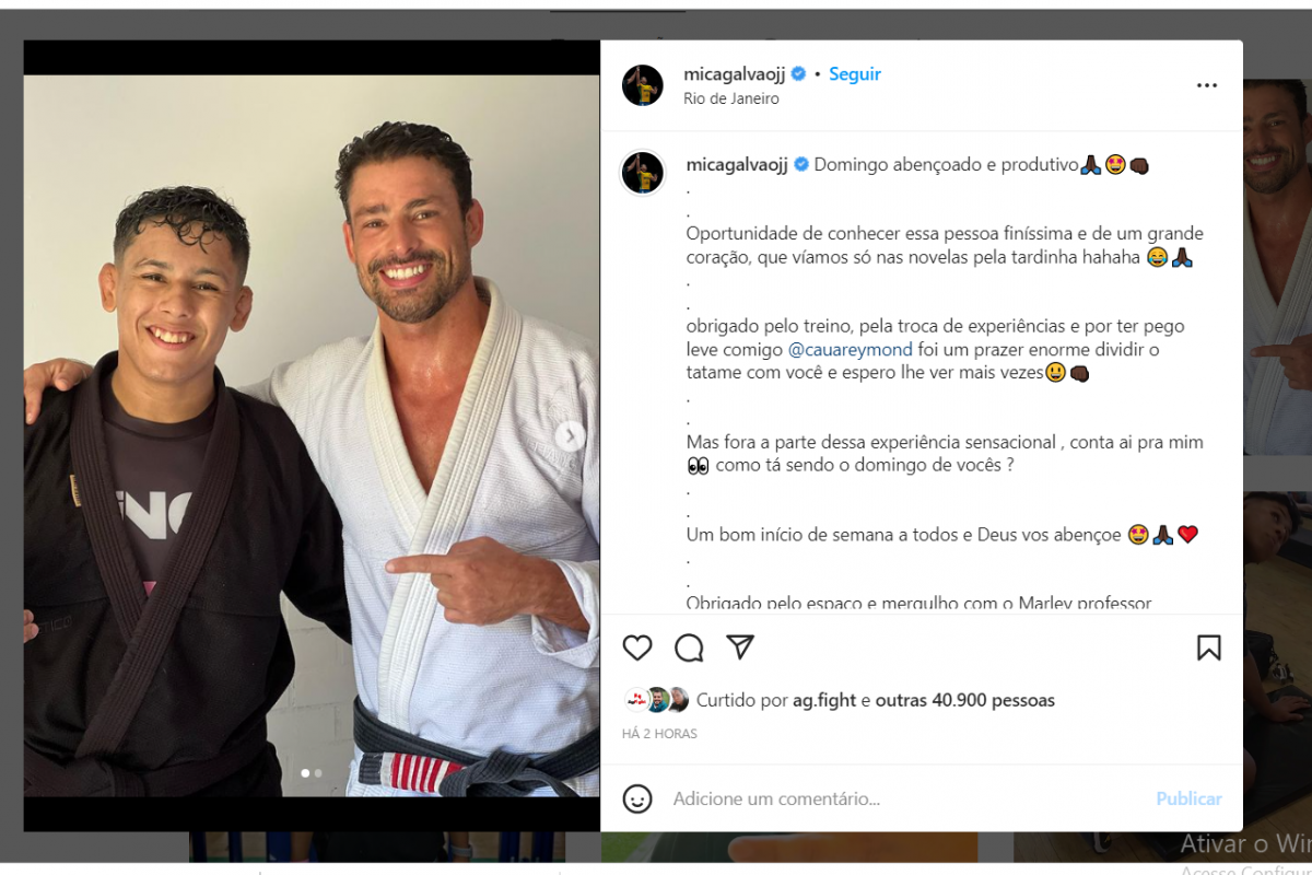 “Domingo abençoado e produtivo. Oportunidade de conhecer essa pessoa finíssima e de um grande coração, que víamos só nas novelas pela tardinha hahaha. Obrigado pelo treino, pela troca de experiências e por ter pego leve comigo Cauã Reymond. Foi um prazer enorme dividir o tatame com você e espero lhe ver mais vezes”, escreveu Mica na legenda do post.