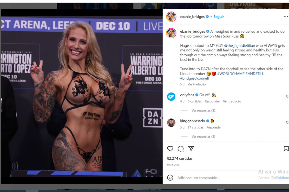Em suas mais recentes aparições nos ringues, Ebanie tem usado as promoções de suas lutas para também se autopromover. Na fatídica pesagem, inclusive, a boxeadora australiana inseriu o usuário de sua conta oficial no ‘Onlyfans’ – plataforma de conteúdo pago tradicionalmente adotada para compartilhar conteúdos sensuais – em seu corpo (veja abaixo ou clique aqui).