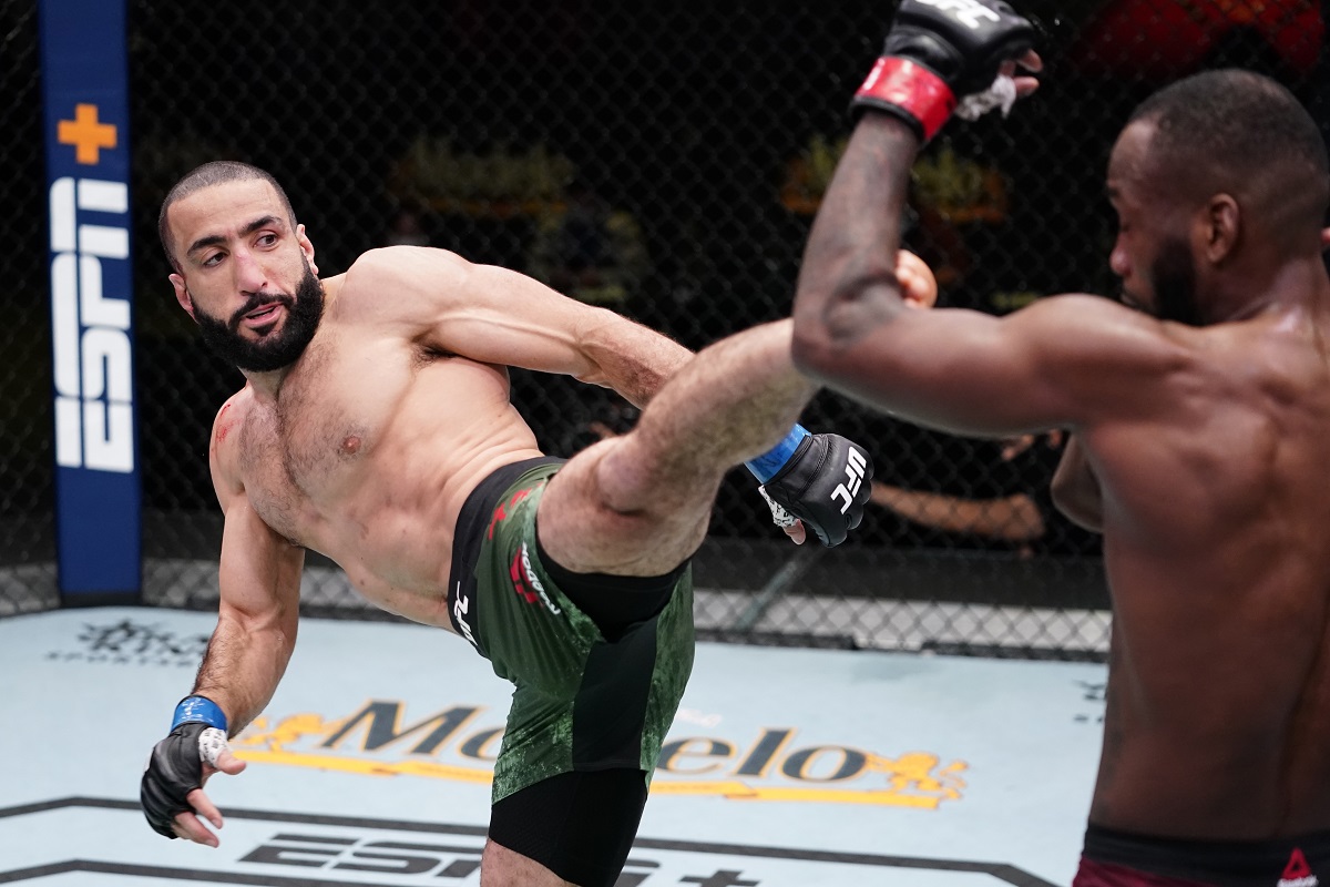 LAS VEGAS, NEVADA - MARCH 13: (L-R) Bulal Muhammad kicks Leon Edwards of Jamaica in a welterweight fight during the UFC Fight Night event at UFC APEX on March 13, 2021 in Las Vegas, Nevada. (Photo by Jeff Bottari/Zuffa LLC via Getty Images)