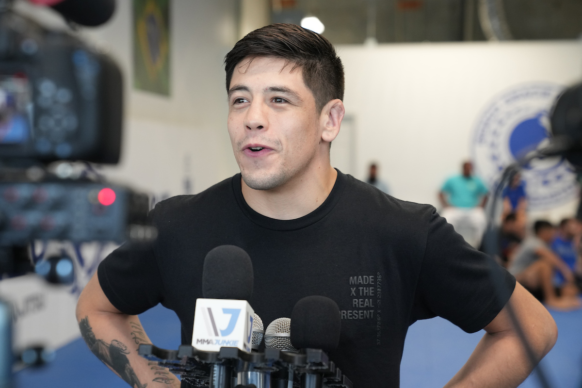 Houston, TX - AUGUST 6: Brandon Moreno (UFC Flyweight Champion) talks with the press prior to conducting a seminar / training session with the Brazilian jiu-jitsu students at Renzo Gracie Jiu-Jitsu on August 6, 2021 in Lake Houston, TX, United States. (Photo by Louis Grasse/PxImages)