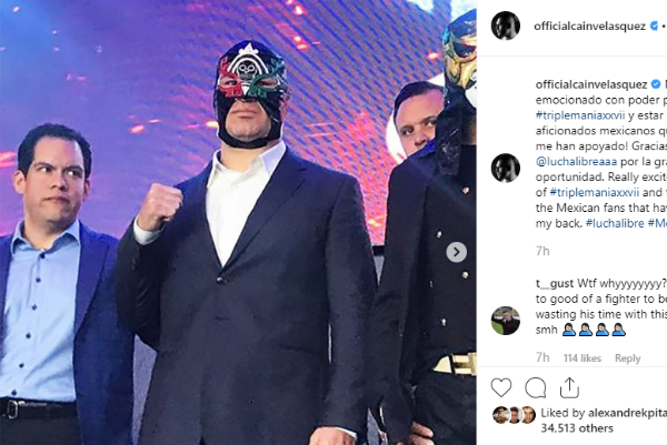 Sem competir no MMA desde fevereiro deste ano, quando foi nocauteado por Francis Ngannou, no UFC Phoenix, Velasquez fez duas apresentações no telecatch pela Liga AAA – uma espécie de WWE do mercado mexicano. Além da recompensa financeira vantajosa, caso assine contrato com a WWE, o lutador poderia reencontrar Brock Lesnar – atleta mais bem pago da organização –, desta vez em um confronto de lutas simuladas, já que ambos se enfrentaram em 2010, pelo título dos pesados do UFC, com vitória por nocaute de Cain.