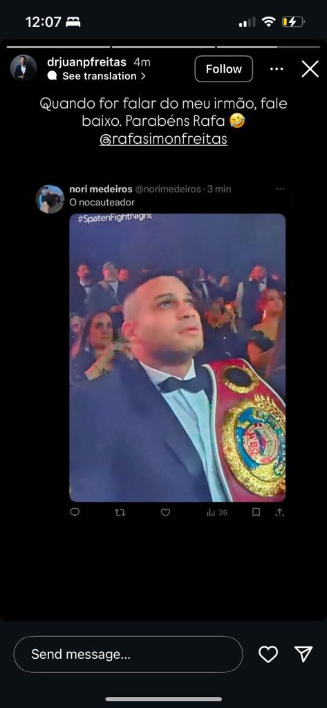 Uma das primeiras confirmações da autoria do soco veio de um dos irmãos de Rafael. Através da ferramenta ‘stories’ no seu perfil do ‘Instagram’, Juan Freitas parabenizou o irmão pelo soco aplicado em Wanderlei Silva. A publicação foi posteriormente apagada pelo médico e também filho de Popó.