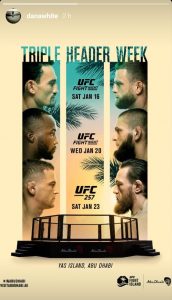 Agora é oficial: o UFC estará de volta à ‘Ilha da Luta’ logo no início de 2021. Através da ferramenta ‘stories’ na sua conta oficial no ‘Instagram’, Dana White, presidente da organização, confirmou que os três primeiro eventos promovidos pelo Ultimate no próximo ano – agendados para os dias 16, 20 e 23 de janeiro – terão como sede a Yas Island, em Abu Dhabi (EAU).