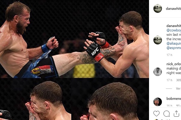 “Parabéns ao ‘Cowboy’ Cerrone pela impressionante vitória da noite passada e muito respeito ao incrivelmente duro Al Iaquinta pela luta maravilhosa!”, escreveu o presidente da maior liga de MMA do planeta.