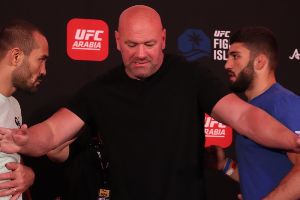Com duelo marcado para este sábado (18), os atletas se estranharam assim que cruzaram os olhos. Mas, por terem que ficar próximos um do outro para que a imprensa registre o momento, o clima esquentou e precisou até mesmo da intervenção de Dana White, presidente do UFC.