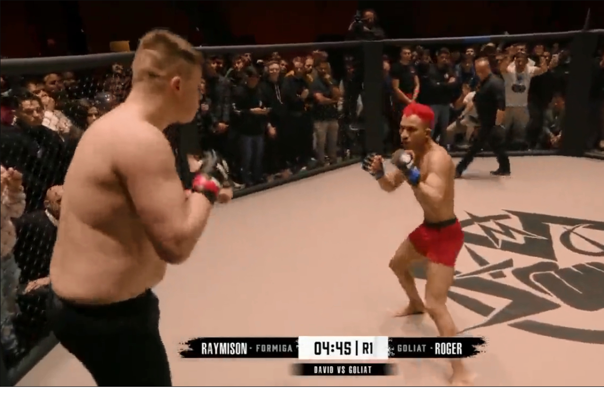 Na última sexta-feira (17), o mundo das lutas foi palco para o que poderia ser descrito como uma reconstituição da famosa história de Davi e Golias. No card do evento ‘Dogfight Wild Tournament’, realizado em Barcelona (ESP), o peso-mosca (57 kg) brasileiro Raymison ‘Formiga’ Bruno, de 1.65m, encarou o peso-pesado espanhol Roger Dalet, de 1.98m e 120 kg, em uma luta de exibição. E assim como na lenda bíblica, o baixinho levou a melhor sobre o gigante (veja abaixo).