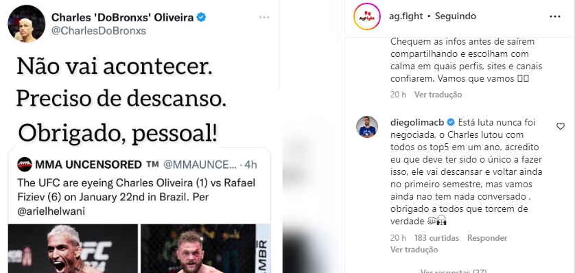 O rumor também foi refutado pelo treinador do ex-campeão do UFC. Em um comentário publicado no ‘Instagram’ da Ag Fight (veja abaixo ou clique aqui), Diego Lima afirmou que ainda não há conversas com o Ultimate sobre o próximo compromisso de Charles no octógono e reiterou que seu pupilo vai aproveitar o tempo livre para descansar da dura rotina de trabalho a qual foi submetido nos últimos tempos. Apesar disso, o líder da ‘Chute Boxe São Paulo’ indicou que Do Bronx deve voltar a lutar ainda nos primeiros seis meses de 2023.