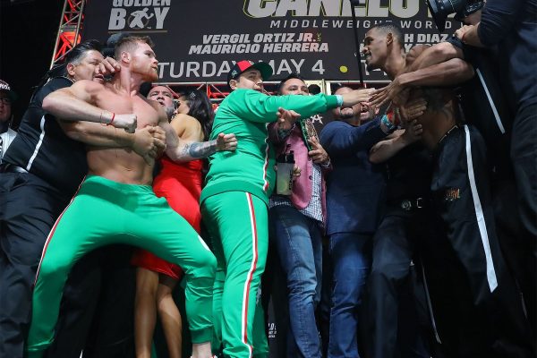 E, no que dependesse dos boxeadores, o confronto agendado para este sábado ocorreria ali mesmo. Afinal de contas, com os ânimos exaltados, os atletas colaram rosto com rosto em um clima pouco amistoso. E bastou um empurrão com a cabeça um pouco mais forte por parte de Jacobs para despertar a fúria de ‘Canelo’ – que normalmente se mantém calmo em cerimônias como essa.