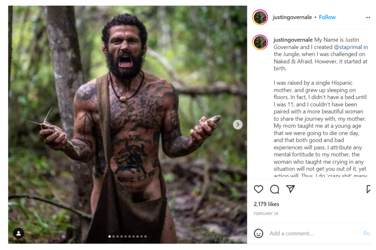 “Fui criado por uma mãe solteira e cresci dormindo no chão. Não tive uma cama até meus 11 anos. Atribuo toda minha força mental à minha mãe, a mulher que me ensinou que chorar não vai lhe tirar de situações ruins, mas ações irão. Além disso, faço coisas malucas que as pessoas têm medo de fazer. Para mim é loucura não fazer algo, mesmo sabendo que vamos morrer um dia. Cresci para me tornar sniper da Marinha, fui para a guerra algumas vezes. Vou usar meu alcance para mostrar que tudo é possível com a mentalidade certa. Confiram o episódio desta noite de ‘Largados e Pelados’”, escreveu o americano.