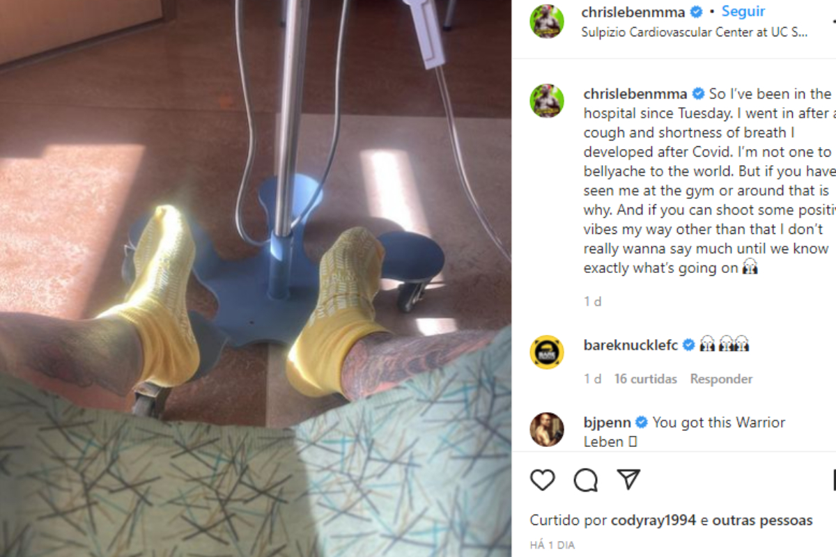“Eu me sinto muito bem. Estou sem todas aquelas outras coisas. Não tenho mais tubos no meu corpo agora – a única coisa é esse oxigênio. Acho que isso foi o mais danificado. Eles (médicos) disseram que 100% dos meus pulmões foram comprometidos, mas eles também disseram que uma recuperação 100% é possível, e eu acho que é isso que vai acontecer. Eu ainda estou vivo, cara, ainda estou aqui. E por isso eu sou grato – o fato que eu posso lutar para voltar a 100% de saúde. Que eu tenha essa oportunidade é uma benção”, contou Leben.