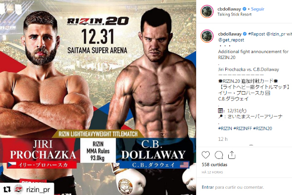 Ainda cumprindo a suspensão de dois anos imposta pela USADA (agência americana antidoping) após testar positivo para diversas substâncias proibidas, CB Dollaway vai retornar ao MMA antes do previsto. O americano – que só estará liberado pela entidade de controle antidoping em dezembro de 2020 – assinou com o Rizin e disputará o cinturão meio-pesado (93 kg) da organização contra o campeão Jiri Prochazka no evento marcado para o próximo dia 31 de dezembro, no Japão.