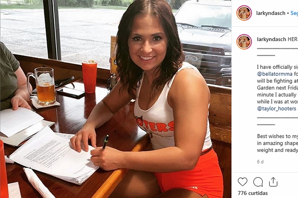 Larkyn Dasch não é uma lutadora convencional. A peso-mosca (57 kg), que estreia no Bellator nesta sexta-feira (14), trabalha no Hooters, tradicional bar americano conhecido pelos uniformes sensuais de suas atendentes. A garçonete vinha trabalhando em dois turnos e, conforme informou em suas redes sociais (veja abaixo ou clique aqui), assinou há apenas seis dias o contrato para lutar no evento de número 222 da organização.