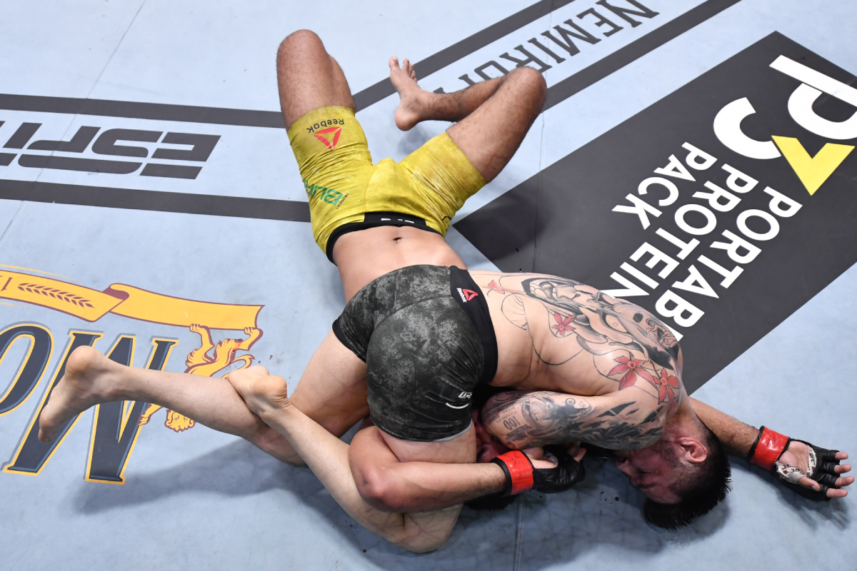 Embalado por duas vitórias no primeiro assalto no evento, o explosivo atleta foi surpreendido e dominado facilmente no assalto inicial. Por baixo após levar a pior na troca de golpes em pé, o brasileiro não conseguiu trabalhar finalizações e acabou recebendo fortes ataques no ground and pound.
