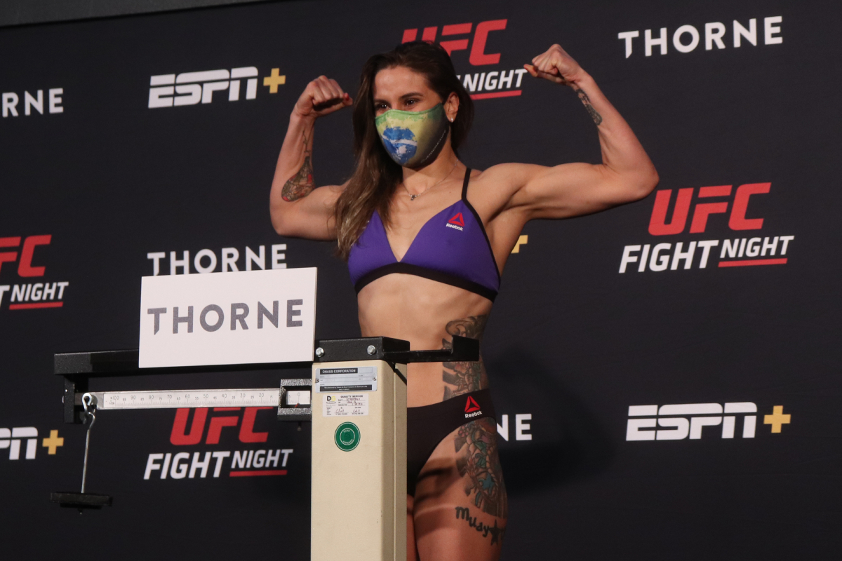 Realizada na manhã desta sexta-feira (31), a pesagem para o show que marca o retorno do UFC à cidade de Las Vegas (EUA) contou alguns momentos de suspense e trocas de lutas em cima da hora. Logo antes da cerimônia começar, Charlie Ontiveros foi anunciado como substituto de Eric Spicely para o duelo contra o brasileiro Markus ‘Maluko’. No entanto, o atleta não chegou a sfoi impedido pela Comissão Atlética de continuar o corte de peso e a luta foi cancelada. Na sequência, apenas sete dos 22 atletas escalados para o card deste sábado encararam a balança sem demora, seguidos de outro pequeno grupo de apenas três lutadores. E foi aí que Jonathan Martinez (único a não bater o peso) estourou em dois quilos o limite dos galos, deixando claro que o dia seria marcado pela dificuldade com o corte de peso – não por acaso, as duas horas reservadas para a pesagem foram usadas por completo com competidores se pesando de forma espaçada. Apesar desse cenário conturbado, tudo ocorreu bem e as outras dez lutas foram confirmadas, deixando com que o destaque positivo ficasse por conta da paranaense Jennifer Maia, que foi a primeira a se pesar e ainda cravou 700 gramas abaixo do permitido. Número seis do ranking dos pesos-moscas, a atleta havia falhado com a balança em suas duas últimas apresentações. Johnny Munoz, que substituiu Ray Borg de última hora, não teve problemas para cravar o limite dos penas e confirmar o duelo contra Nathan Maness. Já o brasileiro Markus ‘Maluko’ aceitou o peso-casado de 88,4 kg para que o duelo contra Charlie Ontiveros ocorresse e também venceu a balança sem problemas. Por fim, Vicente Luque também garantiu sua presença no duelo contra Randy Brown.