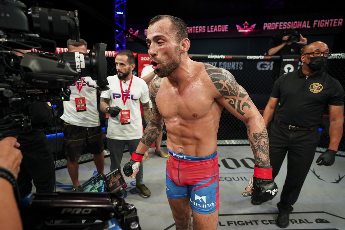 ATLANTIC CITY, NJ - JUNE 17: Joao Zeferino and Jason Ponet in a welterweight fight during PFL 5 at the Ocean Casino Resort on June 17, in Atlantic City, New Jersey. (Cooper Neill / PFL)