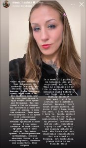 “Eu provavelmente vou estar sem casa em uma semana. Vocês estão surpresos? Mas eu não. Isso é um clássico da minha vida na América. Me tornar sem-teto pouco antes de uma luta no UFC. Isso é uma p*** de um clássico! Na próxima semana eu estarei procurando por um abrigo de sem-teto. Porque eu não acredito mais nas pessoas. Então, já que eu não tenho dinheiro para o aluguel, eu moro onde eu tiver que morar. As pessoas me exploram, e durante essa exploração, eles negligenciam meus limites pessoais e a minha vida. Incluindo tentar me vender para exploração sexual pelas minhas costas. Quem souber de abrigos, instituições de caridade que são destinadas a ajudar, não explorar, por favor me escreva. Estado da Flórida”, desabafou Agapova.