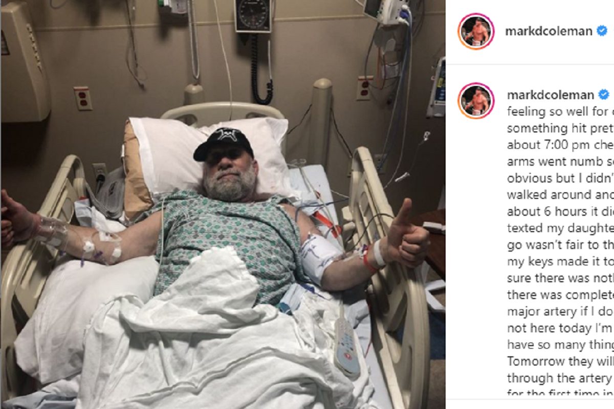 Por meio de sua conta no ‘Instagram’ (veja abaixo ou clique aqui), o primeiro campeão dos pesos-pesados do UFC disse que percebeu que algo estava errado na terça-feira, após sentir o peito travado e os braços dormentes, mas apesar dos sinais, ele tentou dormir. No entanto, ao não sentir nenhuma melhora após seis horas, Mark foi para o hospital, onde os médicos descobriram que uma importante artéria de seu corpo estava bloqueada.