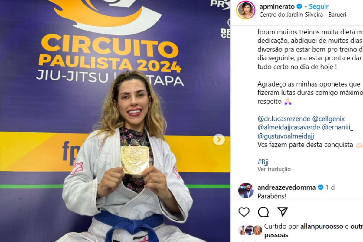 Recentemente, Ana Paula Minerato disputou o Circuito Paulista de Jiu-Jitsu, da FPJJ, e conquistou a medalha de ouro no peso-pena faixa-azul. Em seu perfil oficial no ‘Instagram’, a modelo comemorou o feito e esbanjou orgulho pela sua trajetória até o título (veja abaixo ou clique aqui).