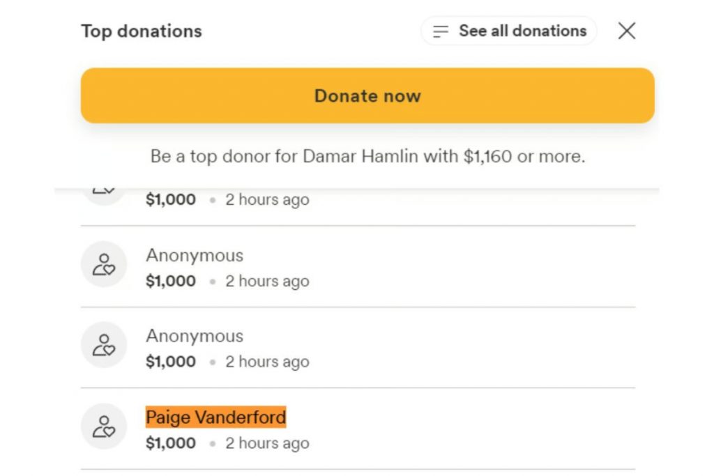 Em suas redes sociais (veja abaixo ou clique aqui), Paige, ciente de sua popularidade, compartilhou o link da campanha em prol da recuperação de Hamlin. De acordo com o site ‘GoFundMe’, ’12 Gauge’ fez uma doação de mil dólares (cerca de R$ 5,4 mil). Atualmente, o valor arrecadado é superior a 4,5 milhões de dólares (cerca de R$ 25 milhões). O drama do jogador se iniciou quando colidiu com um adversário, recebendo uma forte pancada no peito. O atleta recebeu um longo tratamento em campo, precisou de auxílio para respirar, foi levado de ambulância para o hospital e seu estado se tornou crítico após sofrer uma parada cardíaca. Com a gravidade do quadro, Hamlin, de 24 anos, segue sendo monitorado.