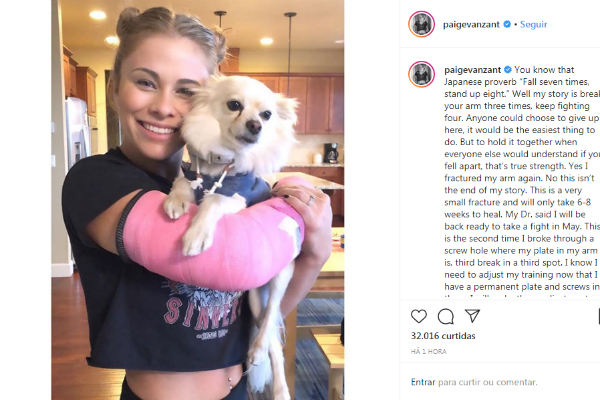 Após ser afastada do combate contra Amanda Ribas – inicialmente marcado para o dia 14 de março -, Paige VanZant utilizou suas redes sociais para justificar seu afastamento do card do UFC Brasília. Em sua conta oficial no ‘Instagram’ (veja abaixo ou clique aqui), a lutadora americana revelou que sofreu mais uma fratura em seu braço direito, lesão que vem se repetindo nos últimos tempos.