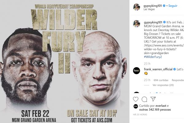 “Está valendo! No dia 22 de fevereiro, na ‘MGM Grand Arena’. Assistam eu nocauteando o Deontay Wilder”, provocou Fury, em resposta.