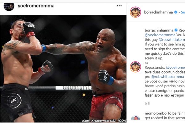 “Yoel Romero, você teve duas oportunidades e perdeu para o Robert Whittaker. Se você quiser vê-lo novamente em breve, você precisa assinar o contrato e lutar comigo o quanto antes! Vamos fazer isso e não estragar tudo”, escreveu Borrachinha em sua conta no ‘Instagram’.