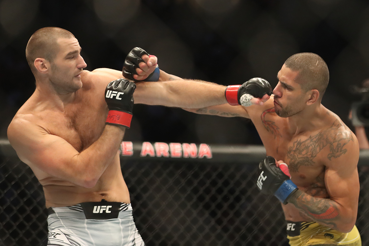 LAS VEGAS, NV - JULY 2: (R-L) Alex Pereira punches Sean Strickland in their Middleweight bout during the UFC 276 at the T-Mobile Arena on July 2, 2022 in Las Vegas, Nevada, United States. (Photo by Alejandro Salazar/PxImages)