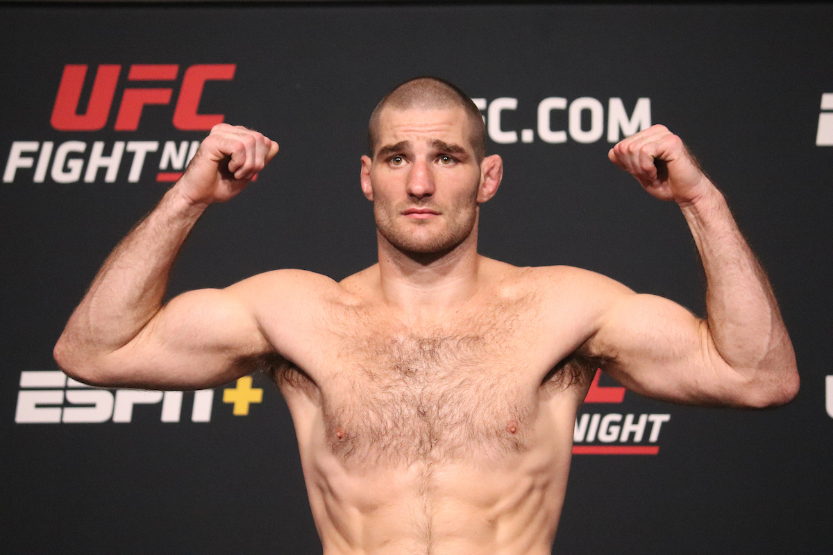 LAS VEGAS, NV - JULY 30: Sean Strickland poses on the scale during the UFC Vegas 33: Hall vs Strickland Weigh-in at UFC Apex on July 30, 2021 in Las Vegas, Nevada, United States. (Photo by Diego Ribas/PxImages)